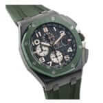 The timepiece boasts a robust 44mm diameter case, encapsulating a vivid green dial with Arabic numerals indices, offering a modern touch to this iconic design. Paired with a comfortable, adjustable rubber strap that fits all sizes, the watch remains as stylish as it is functional. Durability is key, with the watch passing a 30m water resistance test. However, the manufacturer advises against swimming while wearing the watch. Protected by a 2-year International United Watch Center warranty, this “AP Royal Oak Offshore Ceramic Green Black” Watch is a perfect blend of elegance, reliability, and precision – a stunning statement piece for any watch aficionado.