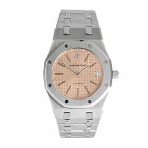 The Audemars Piguet Royal Oak Selfwinding 14802ST is a high quality watch. It features a 904L stainless steel case and bezel, with a salmon pink dial and stick indices. The movement is an automatic caliber 2121, with a power reserve of 60 hours and precision of -3/+3 seconds per day within COSC certification limits. The second hand has a sweep motion. The bracelet is a 904L stainless steel Royal Oak bracelet with adjustable links and a double-fold clasp.
