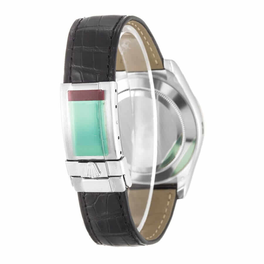 The Rolex Daytona 116519 is a stunning watch that is sure to turn heads. It features a 904L stainless steel case with a white gold finish, a 40.00 mm sapphire crystal, and a black rubber bracelet with adjustable links. The dial is a beautiful mother of pearl with Roman numerals and ceramic hour markers. The movement is an automatic caliber 4130 with a 60-hour power reserve and a precision of -3/+3 seconds per day within COSC certification limits. It also has a sweep second hand and is water-resistant up to 30m.