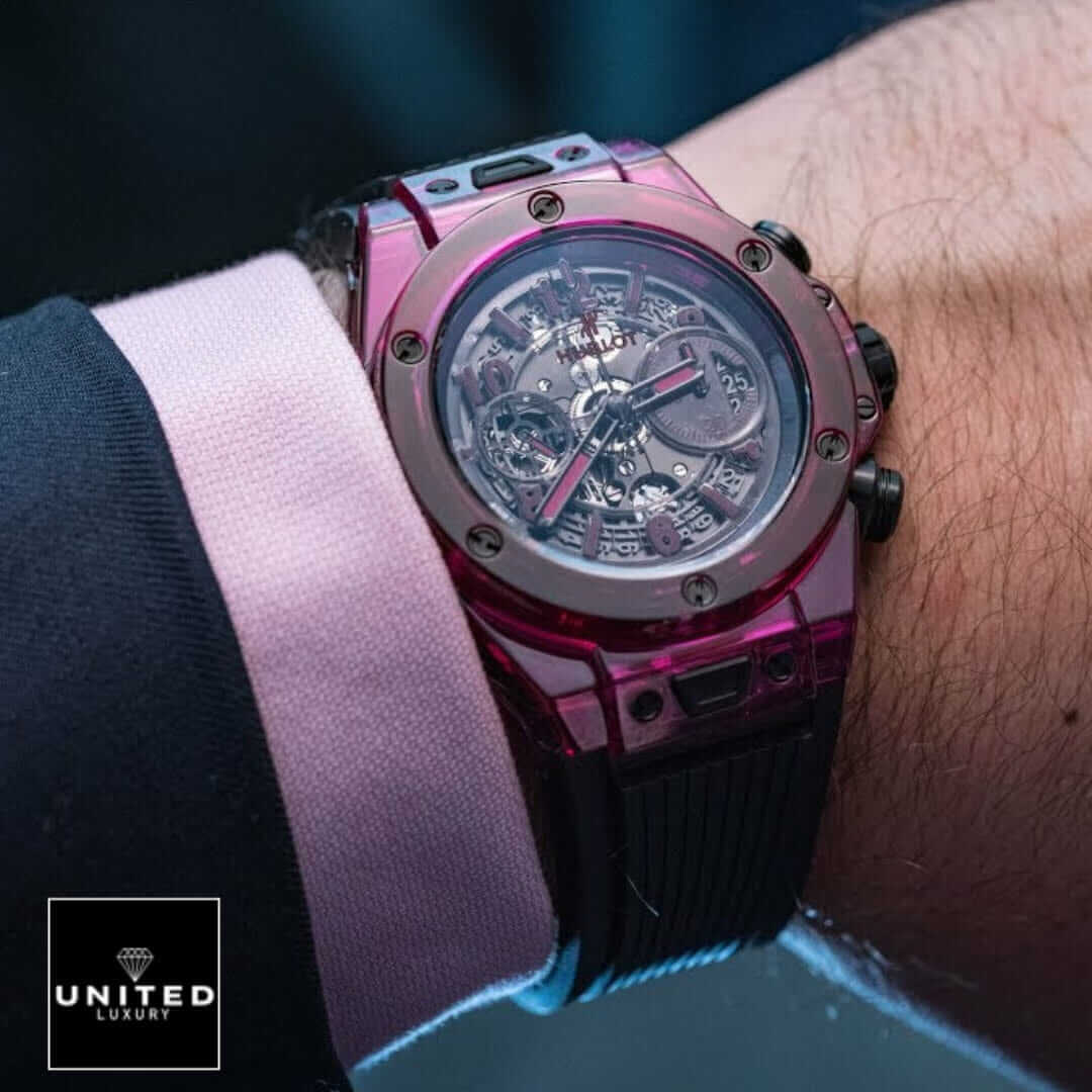 The Hublot Big Bang Unico Red Sapphire 411.JR.4901.RT.1902 Sapphire is a luxurious watch that is sure to turn heads. It features a 45.00 mm resin, sapphire, and gem set case in a striking blue color. The bezel is made of resin and sapphire and is black in color. The crystal is a sapphire crystal for added durability. The bracelet is made of rubber and is adjustable for all sizes. It also features a double-fold clasp made of stainless steel and black in color.