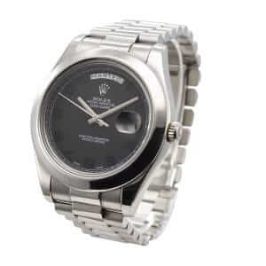 The Rolex 218206 Black Dial is a luxurious watch that is sure to impress. It features a 904L stainless steel case and bezel, with a white gold bezel color. The crystal is made of sapphire, and the size is 41.00 mm. The bracelet is also made of 904L stainless steel, with an adjustable link for all sizes. The black dial features Roman numerals and 904L stainless steel stick hour markers and hands.