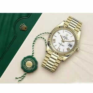 The Rolex Day-Date II Collection Gold White Roman Dial 218238-0037 is a luxurious watch that is sure to impress. It features a 904L stainless steel case with a yellow gold finish, a sapphire crystal, and a 41.00mm size and 12.00mm thickness. The bracelet is also made of 904L stainless steel with an adjustable link and a folding clasp in yellow gold. The dial is white with Roman numerals and stick hour markers and hands.