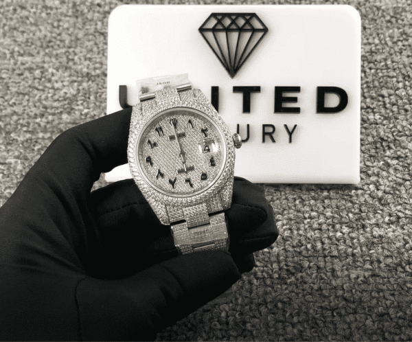 The Rolex Datejust 116300 White Gold Diamond Arabic Dial Iced Out is a beacon of sophisticated craftsmanship and timeless elegance, meticulously designed to catch the eye and capture the heart. This exquisite timepiece is crafted to perfection, mirroring the grandeur and precision of the original Rolex Datejust with an alluring twist. Imagine the subtle weight of its 904L stainless steel case and bezel against your wrist, the gleam of its gem-set design twinkling under any light, and the cold, smooth touch of its sapphire crystal, a robust 41.00 mm masterpiece that provides an unclouded view of the stunning Arabic numerals on the dial.