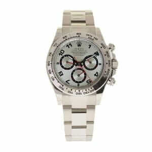 Every feature of the** Rolex Daytona 116509 White Gold Silver Dial ** has been meticulously ted, including the signature sweep motion second hand and comprehensive functionalities such as hours, minutes, small seconds, date, and chronograph. For those who demand robustness alongside elegance, the 30m water resistance offers peace of mind, making it a reliable companion in varying conditions. And, with a full 2-year international warranty, your investment in this exceptional timepiece is well protected.