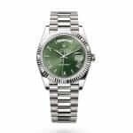 This Rolex Day-Date 228239-0033 Stainless Steel Green Dial Oyster is a stunning watch. It features a 904L stainless steel case with a white gold color and a sapphire crystal. The 40.00 mm case is 12.00 mm thick and is paired with a 904L stainless steel Oyster bracelet with adjustable links. The dial is nicknamed “”Olive”” and is green in color with Roman numerals as indices. The hour markers are made of 904L stainless steel and the hands are stick-shaped.